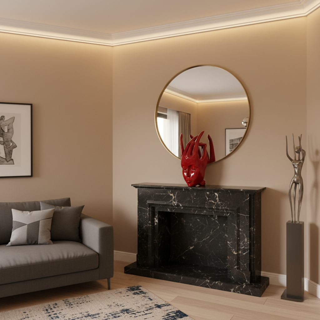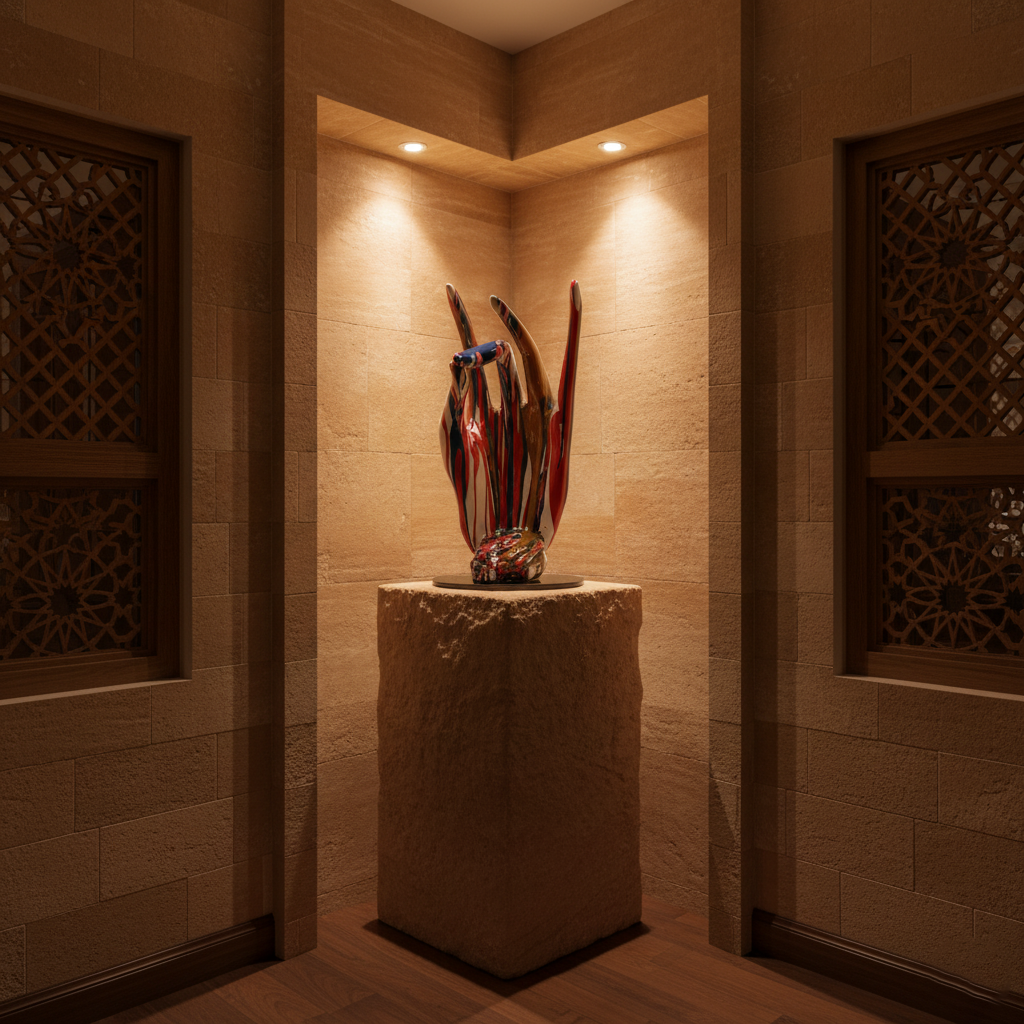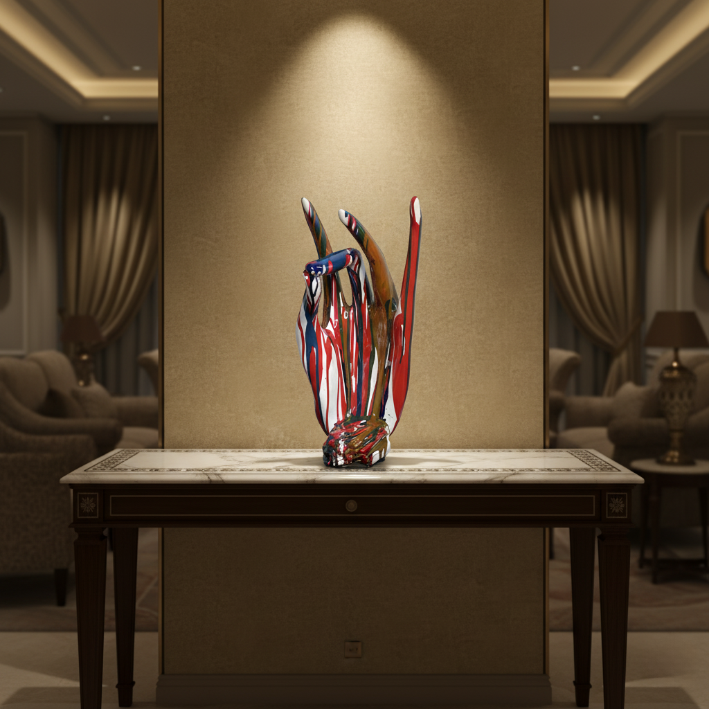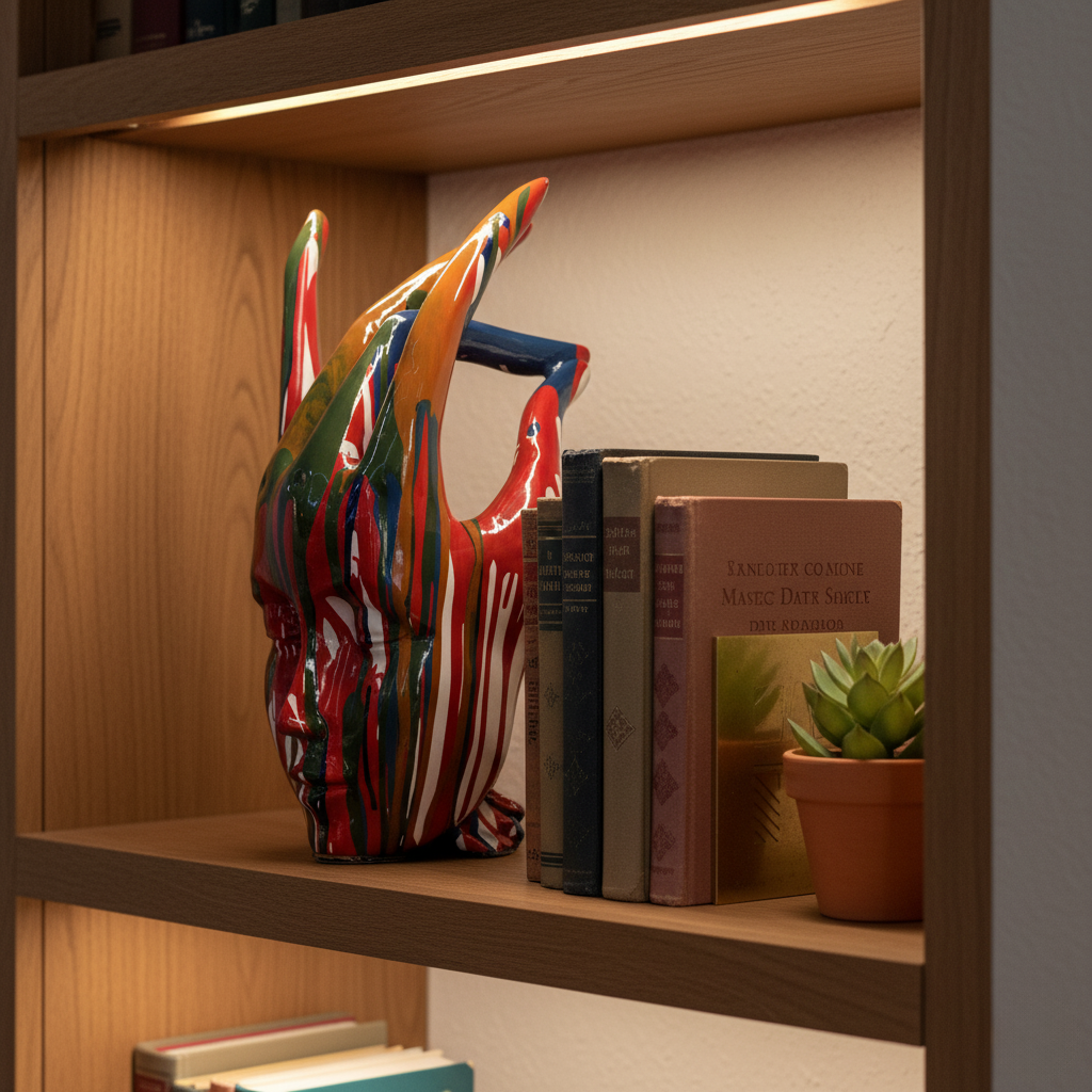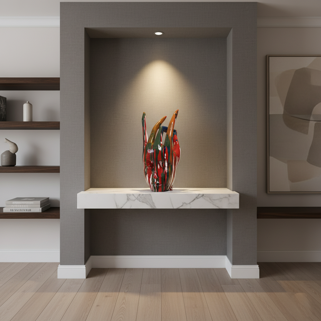 - Use subtle lighting (spotlight or downlight) to highlight the gloss and contours.