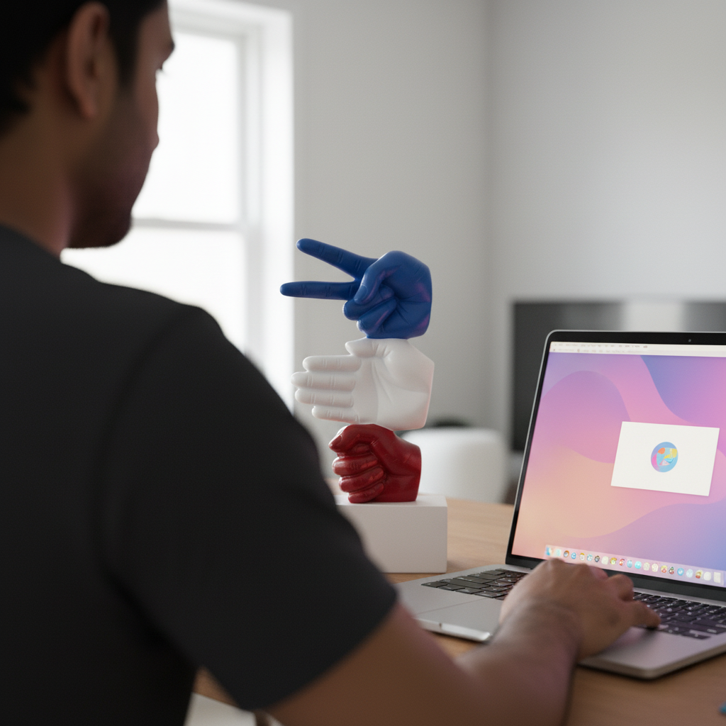 - Colors: Red (fist), White (palm), Blue (peace sign).